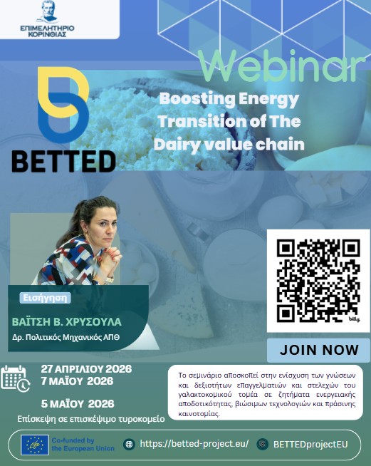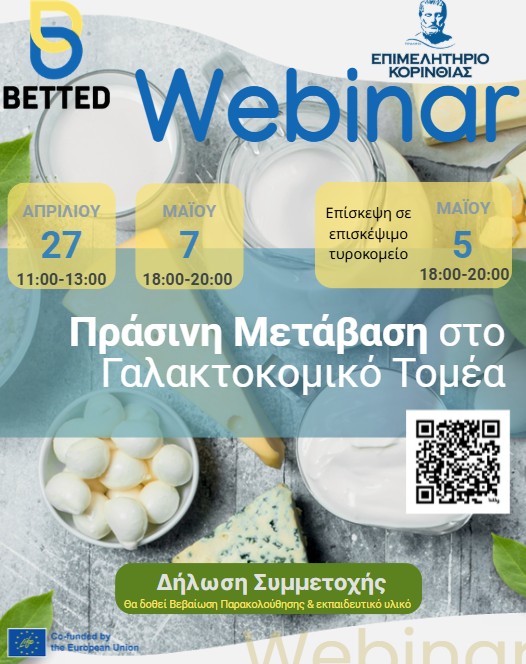 Το Επιμελητήριο Κορινθίας, στο πλαίσιο του ευρωπαϊκού έργου BETTED – Boosting the Energy Transition of the Dairy Value Chain, διοργανώνει εξειδικευμένα διαδικτυακά εκπαιδευτικά σεμινάριά (webinar) με τίτλο: