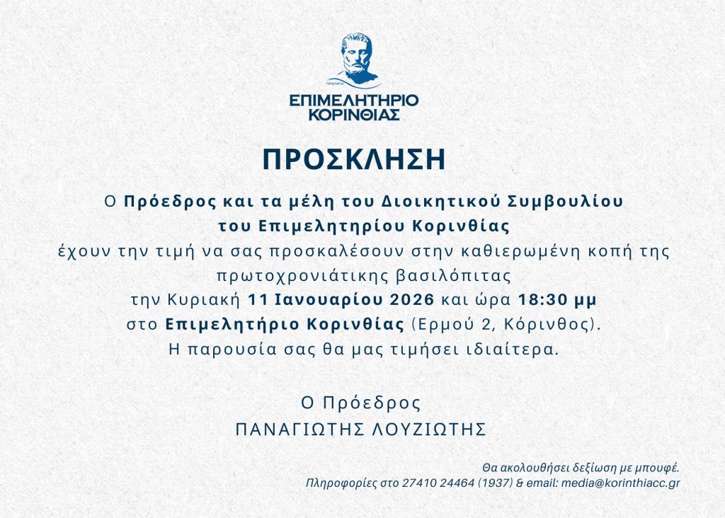 Ο Πρόεδρος και τα Μέλη του Διοικητικού Συμβουλίου του Επιμελητηρίου Κορινθίας έχουν την τιμή να προσκαλέσουν τα μέλη και τους φορείς της Κορινθίας στην καθιερωμένη κοπή της Πρωτοχρονιάτικης Βασιλόπιτας.