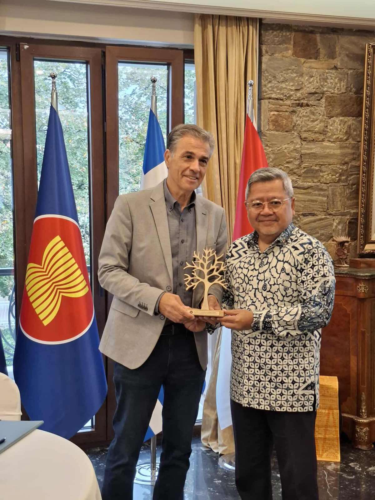 Τον Πρόεδρο του Επιμελητηρίου Κορινθίας κ. Παναγιώτη Λουζιώτη υποδέχτηκε ο Πρέσβης της Ινδονησίας κ. Dr. Bebeb A.K. Nugraha Djundjunan με σκοπό να θέσουν έναν κοινό άξονα δράσεων για την ανάπτυξη συνεργασιών. Η συνάντηση έλαβε χώρα παράλληλα με τη συμμετοχή του Προέδρου κ. Λουζιώτη στο 7ου Επιχειρηματικό Φόρουμ Ινδονησίας – Ελλάδας.